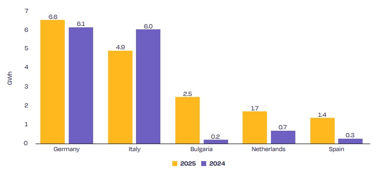 Prema prvom izdanju izvještaja EU Battery Storage Market Review (Pregled tržišta baterijskog skladištenja energije u EU) koji je objavila organizacija SolarPower Europe, ukupni kapacitet baterijskog skladištenja u EU sada iznosi preko 77 GWh. Najveći doprinos u 2025. dale su Njemačka sa 6,6 GWh, Italija sa 4,9 GWh i iznenađujuće brzorastuća Bugarska, koja je dodala 2,5 GWh. Holandija i Španija slijede sa 1,7 GWh i 1,4 GWh novih kapaciteta.